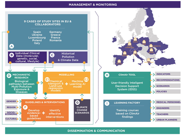 The ClimAIr project was conceived to address the pressing and interconnected challenges posed by climate change and air pollution, which are primarily linked to anthropogenic emissions.These challenges have significant impacts on various aspects of life, including the environment, public health, and socio-economic conditions. ClimAIr’s main goal is to explore the connection between climate change, air pollution, and non-communicable respiratory diseases using AI-powered tools. The project focuses on analysing relevant environmental data and ethical clinical data provided by selected European health centres.